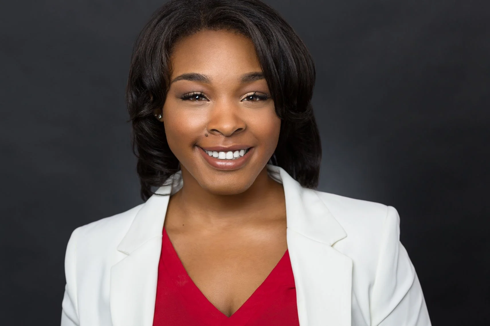 Shayla Weary wears a white blazer in a headshot. We employed a dark background for contrast. Make sure your attire is cleaned and pressed like hers before you arrive.