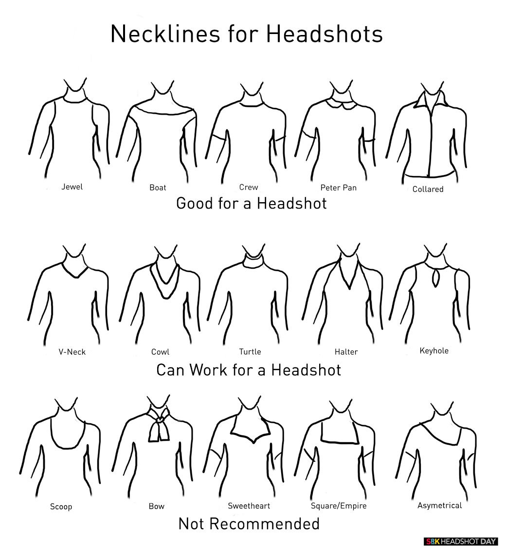 A classic headshot is cropped at or above the sternum. So the bottom of the neckline needs to be at that level if you want it in the headshot. Here are some necklines and our opinions on which work best in a headshot.